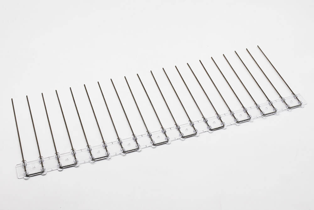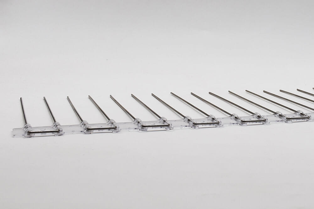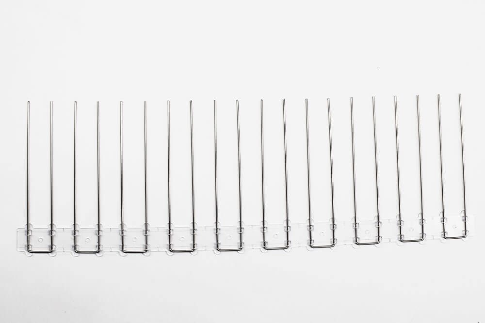 Nous disposons 40 pointes / mètres, celles-ci faisant 16 cm de haut pour 2 mm de diamètre.